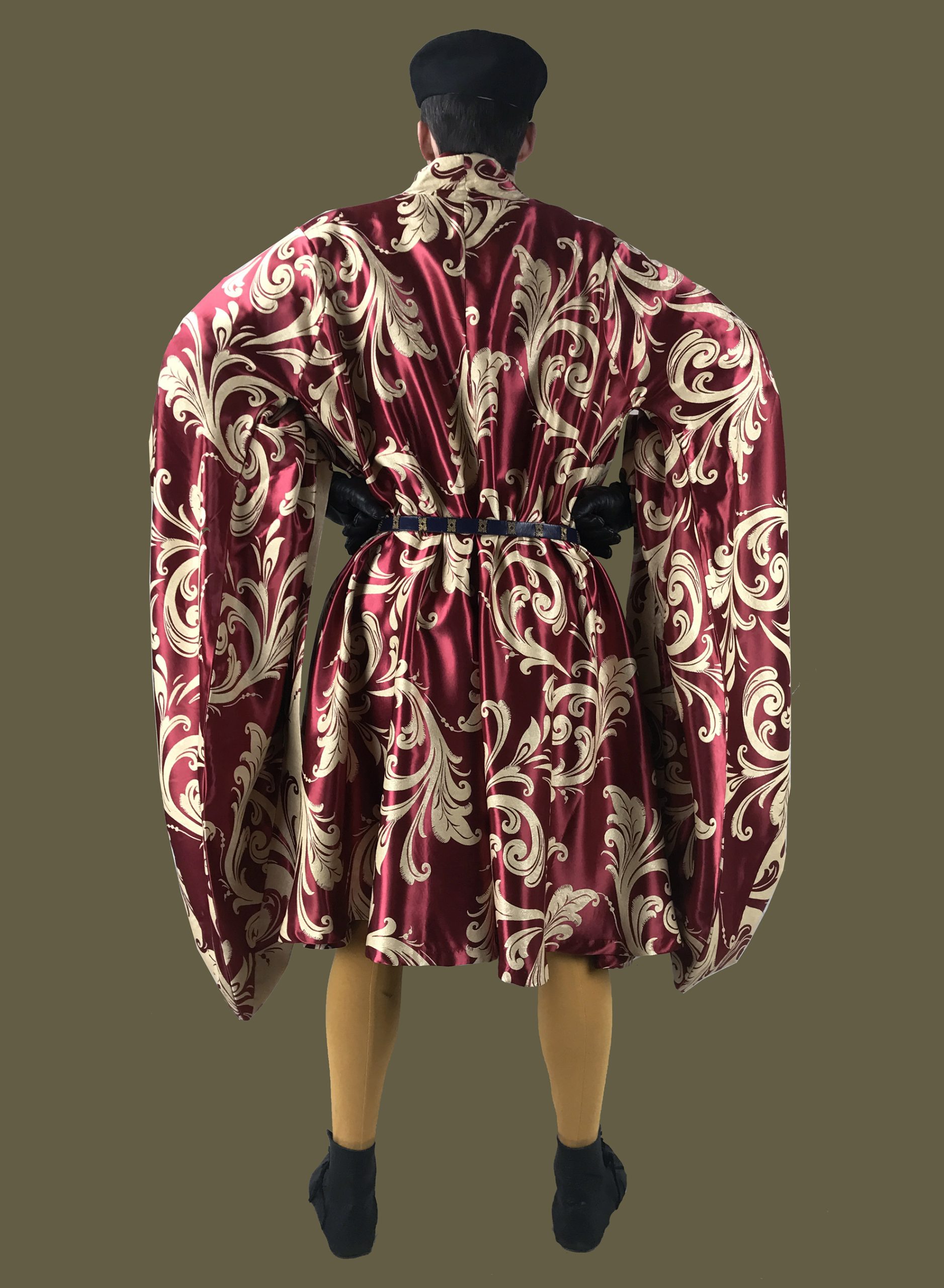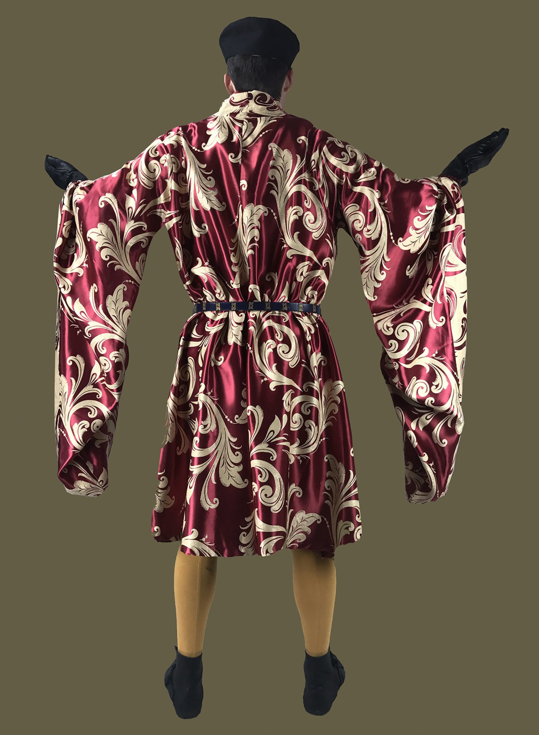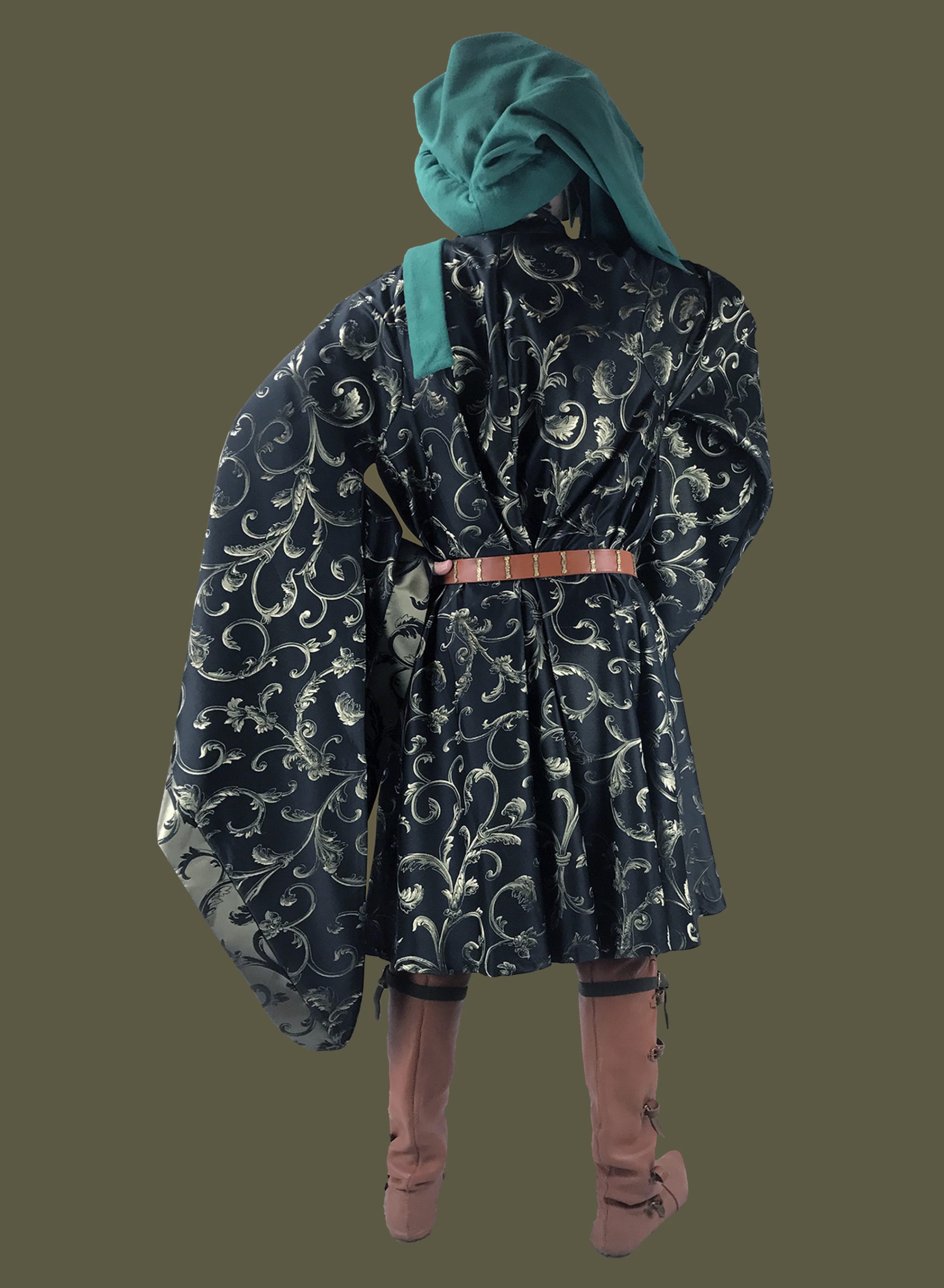 The houppelande continued to evolve throughout the 1400s, and developed a rather unique and exaggerated silhouette by the 1470s. We have chosen to reproduce an earlier style of garment that reflects an earlier, more natural style fashionable amongst nobles, courtiers and wealthy burghers at the start of the 15th century. Based on the beautiful examples in the Tres Riche Houres of the Duc de Berry, this style had a broad, international appeal, and can be found throughout England, France, northern Italy and the Holy Roman Empire.