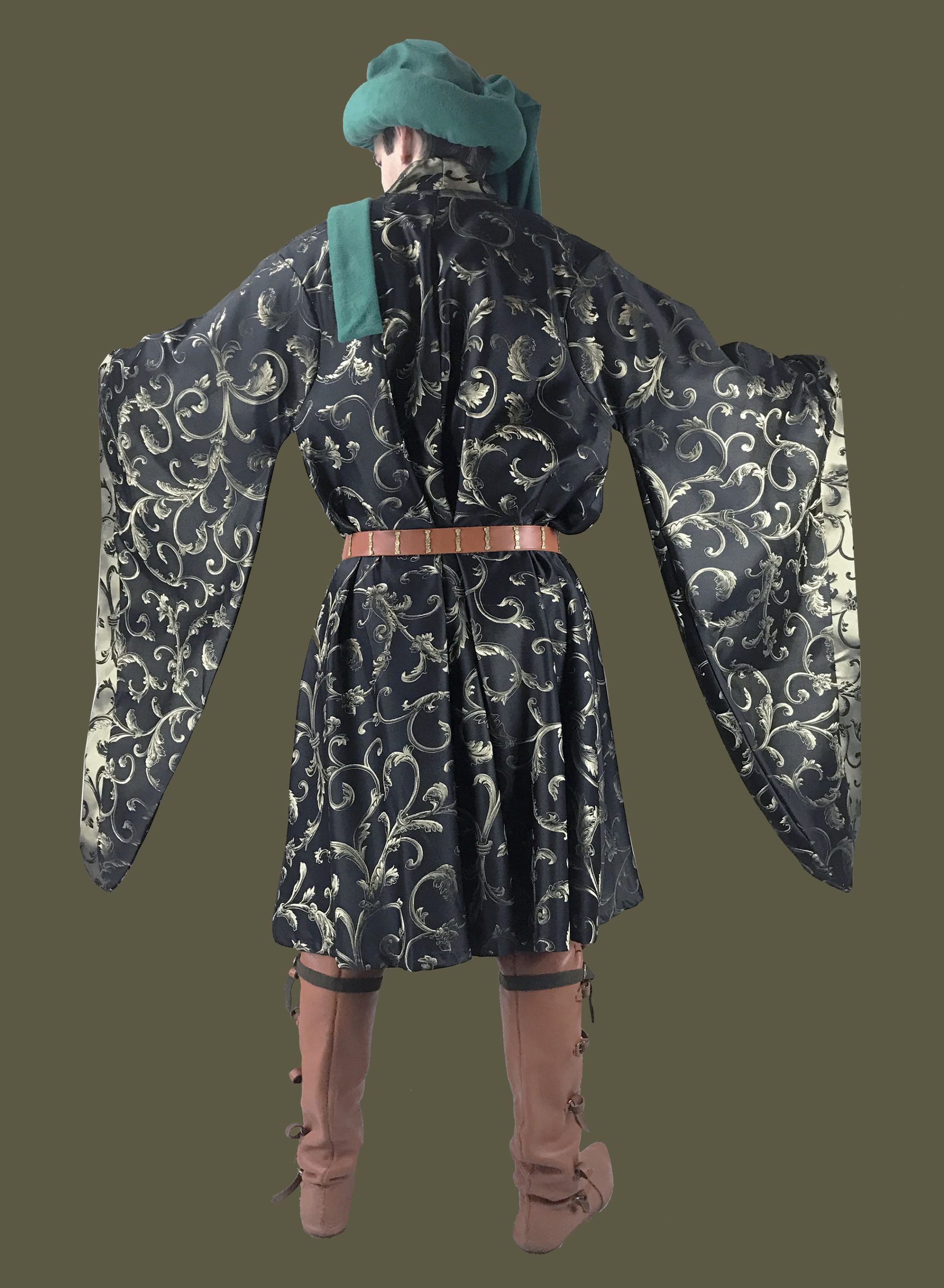 This Lord dons a black and silver Brocade Houppelande. He accents with a red Italinate Hat for a splash of color. His brown Tall Boots match his Decorated Belt. To complete his look he places his valuables in his custom brocade tasseled Pouch. Beneath he wears his Collared Shirt , Cotehardie and Simple Hose