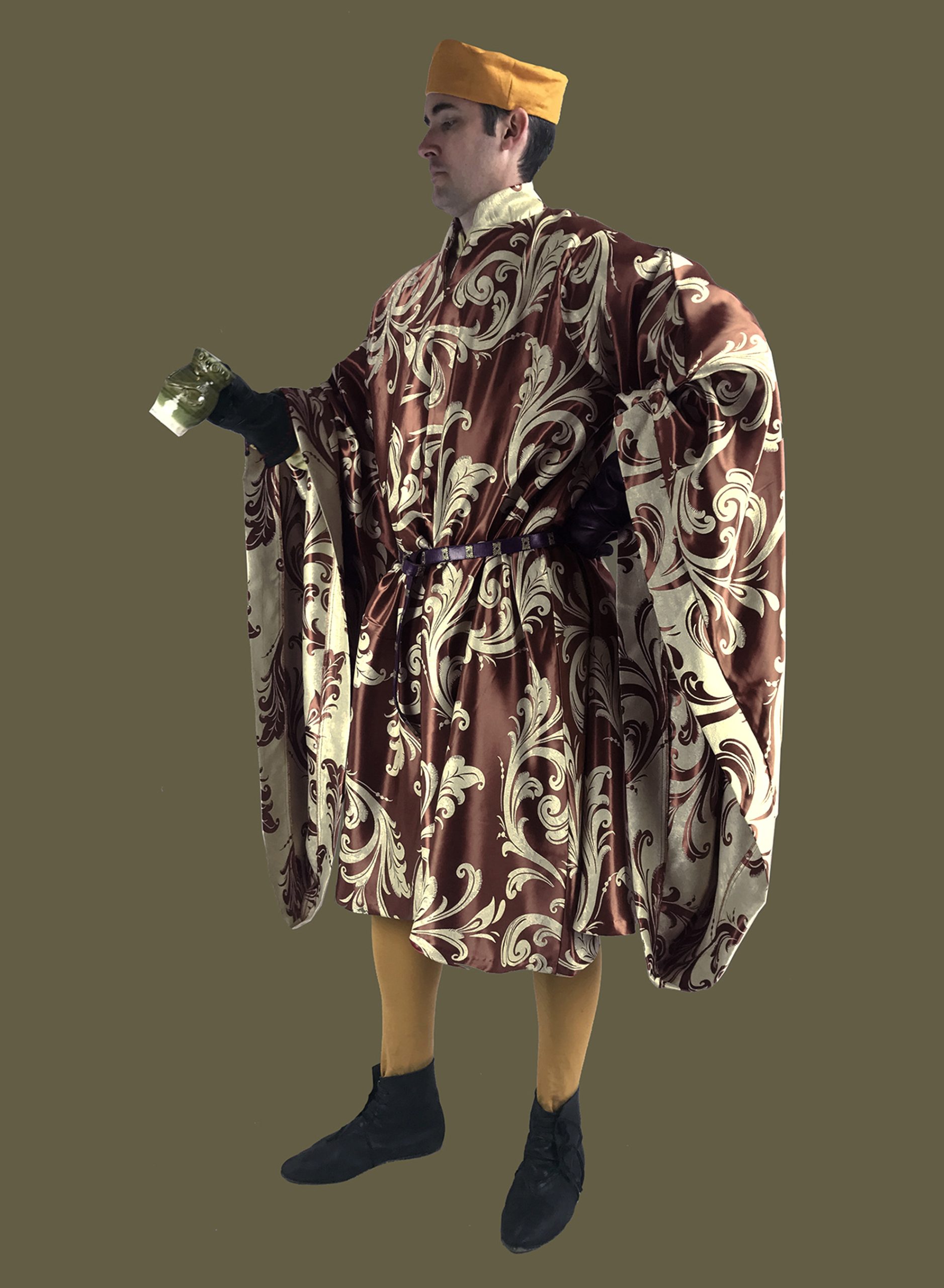 This Lord has opted for a striking burgundy and gold velvet Brocade Houupelande to catch the rays of sunshine. Beneath he wears his brocade Cotehardie, 15th Century Collared shirt, and gold Joined Hose. He matches his Ankle Boots to his black Turret Hat. His black Gloves keep his hands warm and protected.