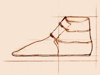 Drawing after extant boot from Devente, The Netherlands (Overstegen site) circa 10-12th century
