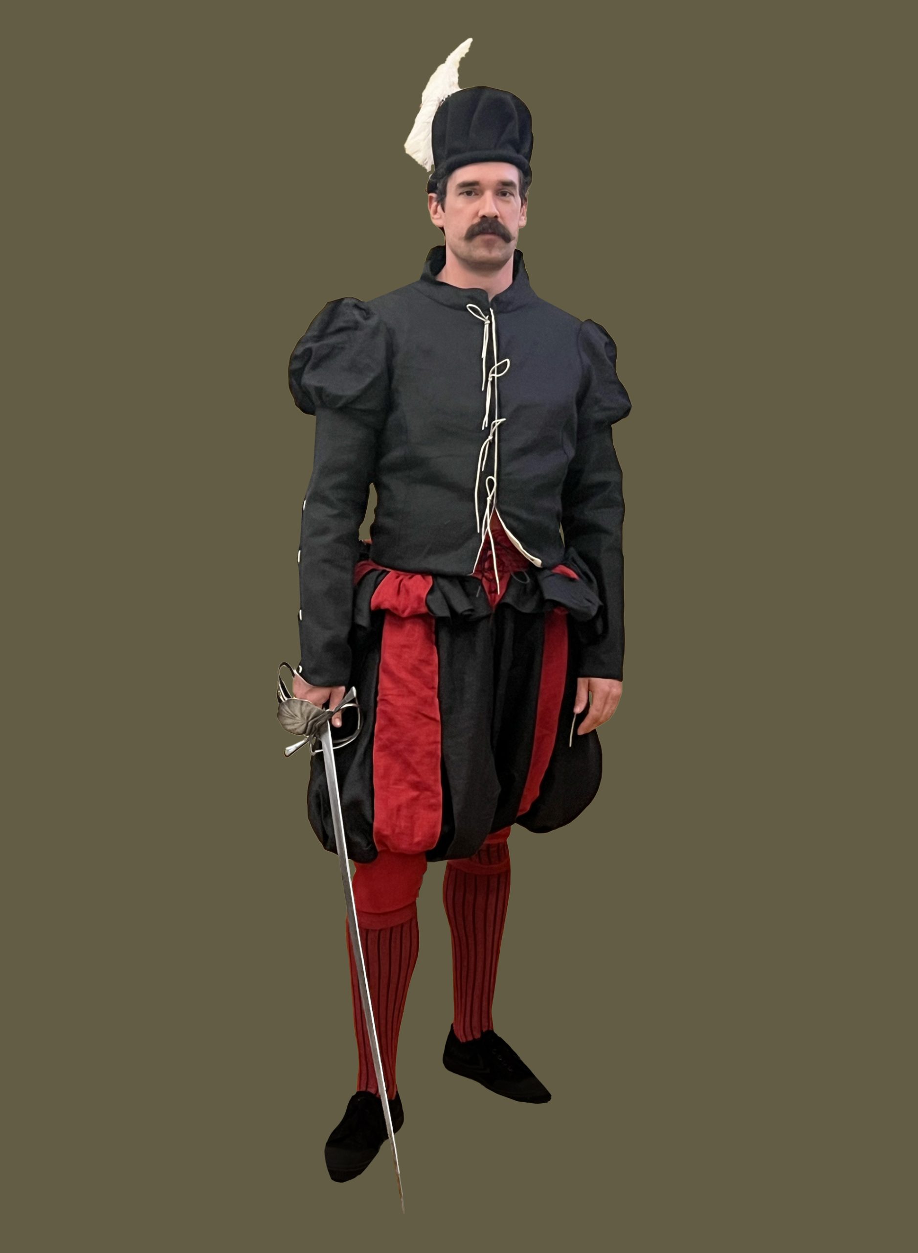 This fighter prepares for a sparring match dressed in his finest garbs. he wears a well fitted black Renaissance Wrestling Jacket, paired with a sharp pair of Meyer Fencing Pants made with a custom gold contrast color. he finishes the look with a pair of black Tall Athletic Socks.