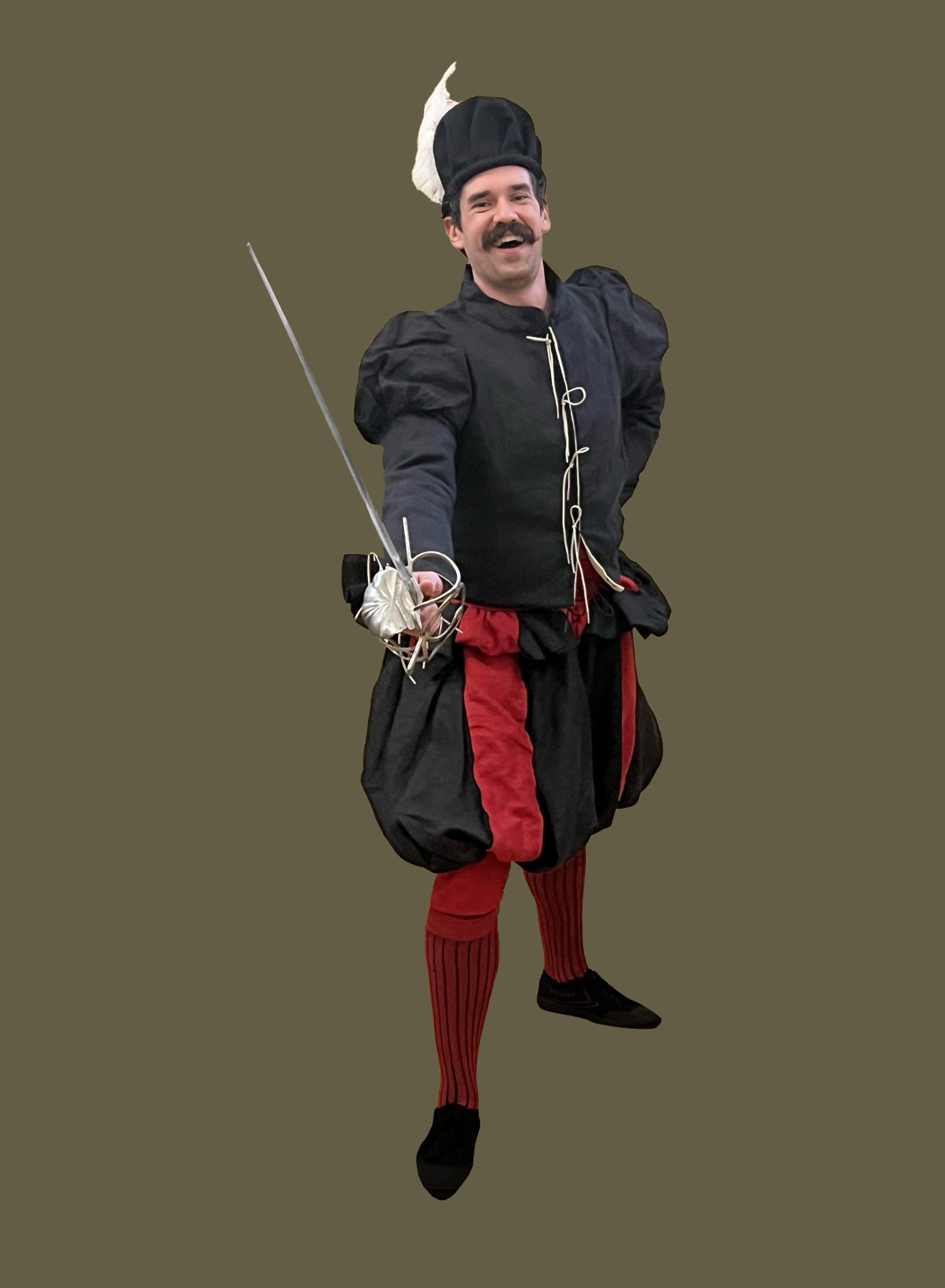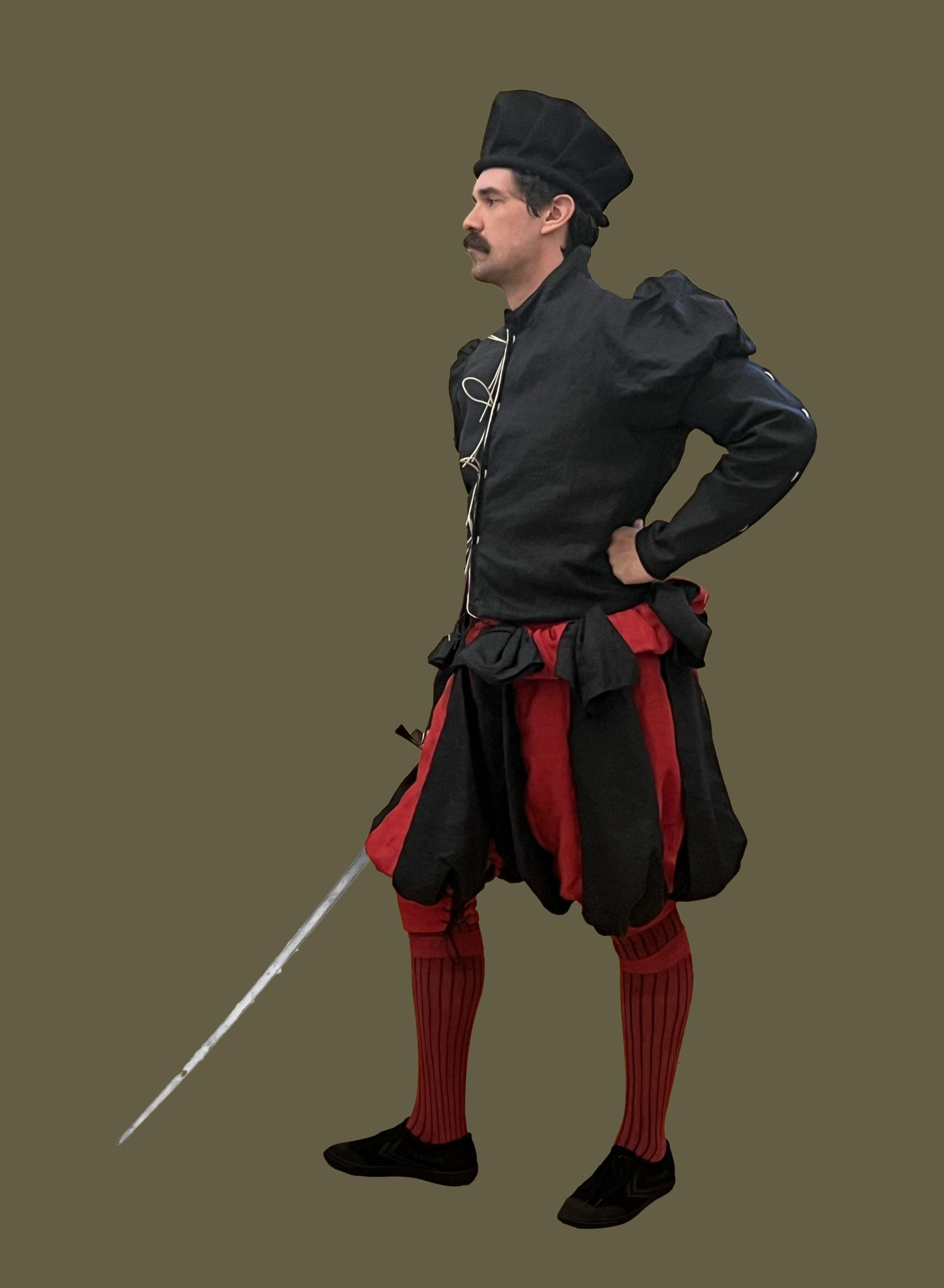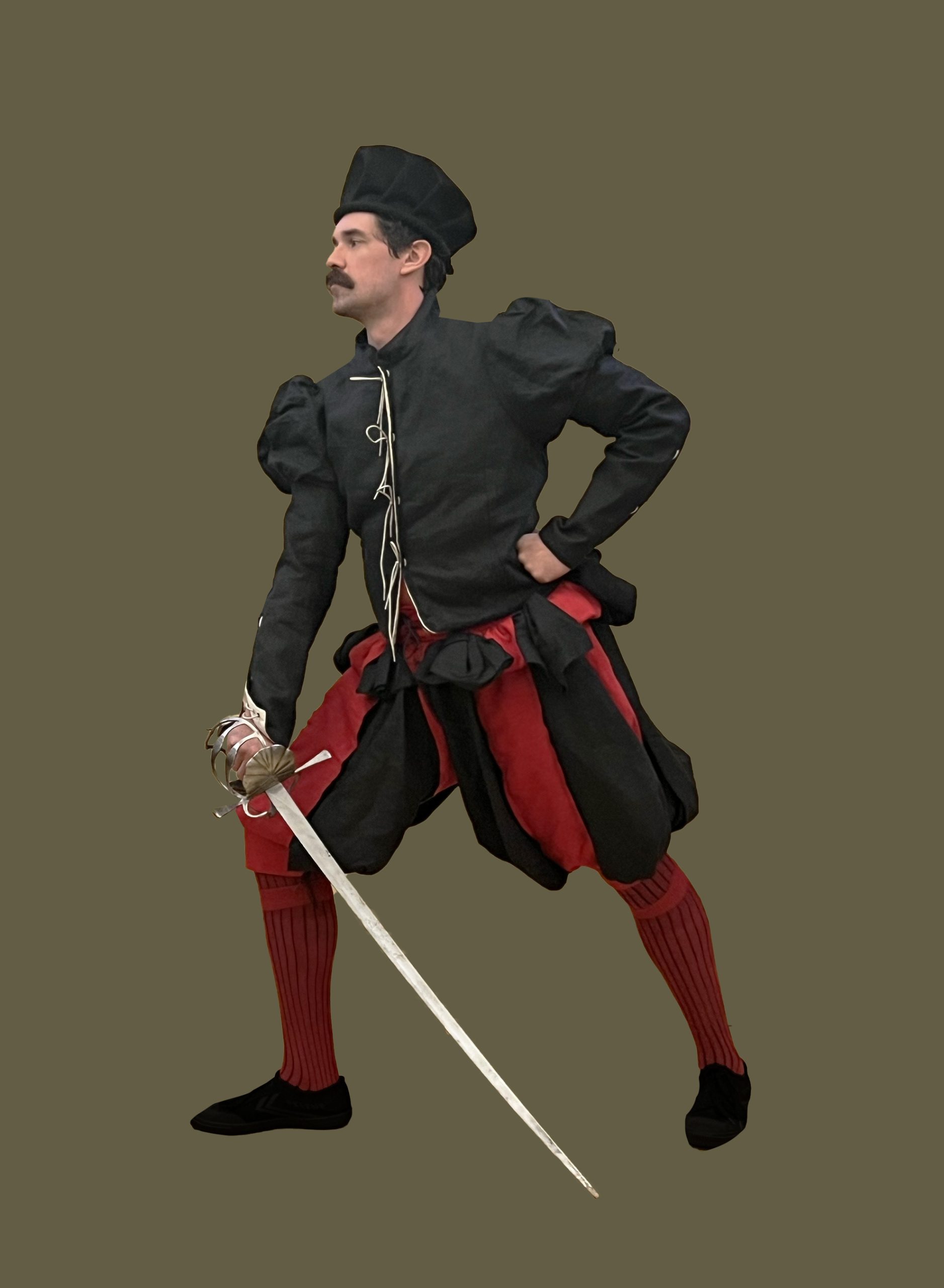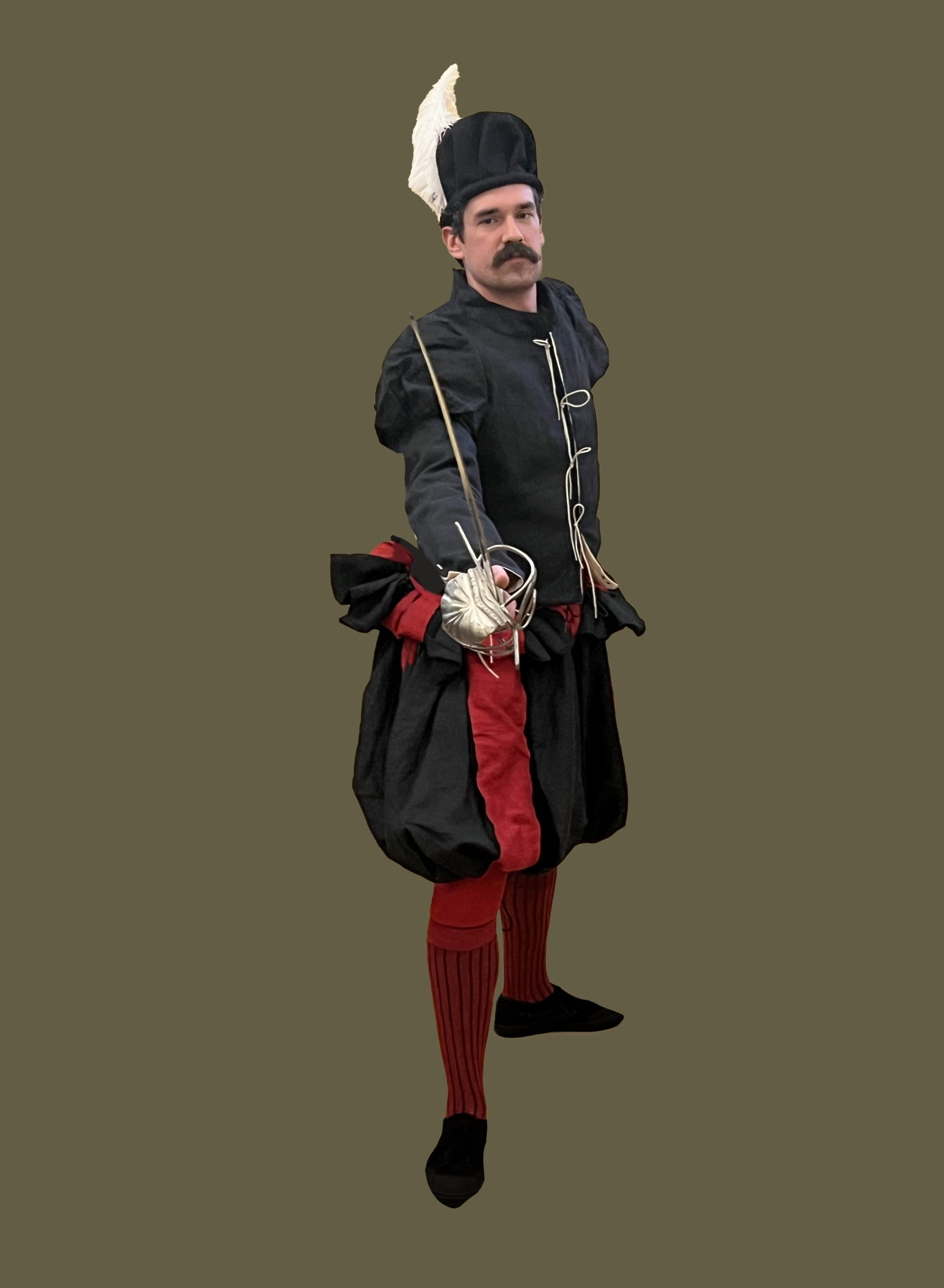 A confident fencer shows off his smart, all blue ensemble. He wears a tight fitting Fencing Doublet which contrast nicely with his flowing and loose Meyer Pants. he finishes his look with black Tall Athletic Socks.