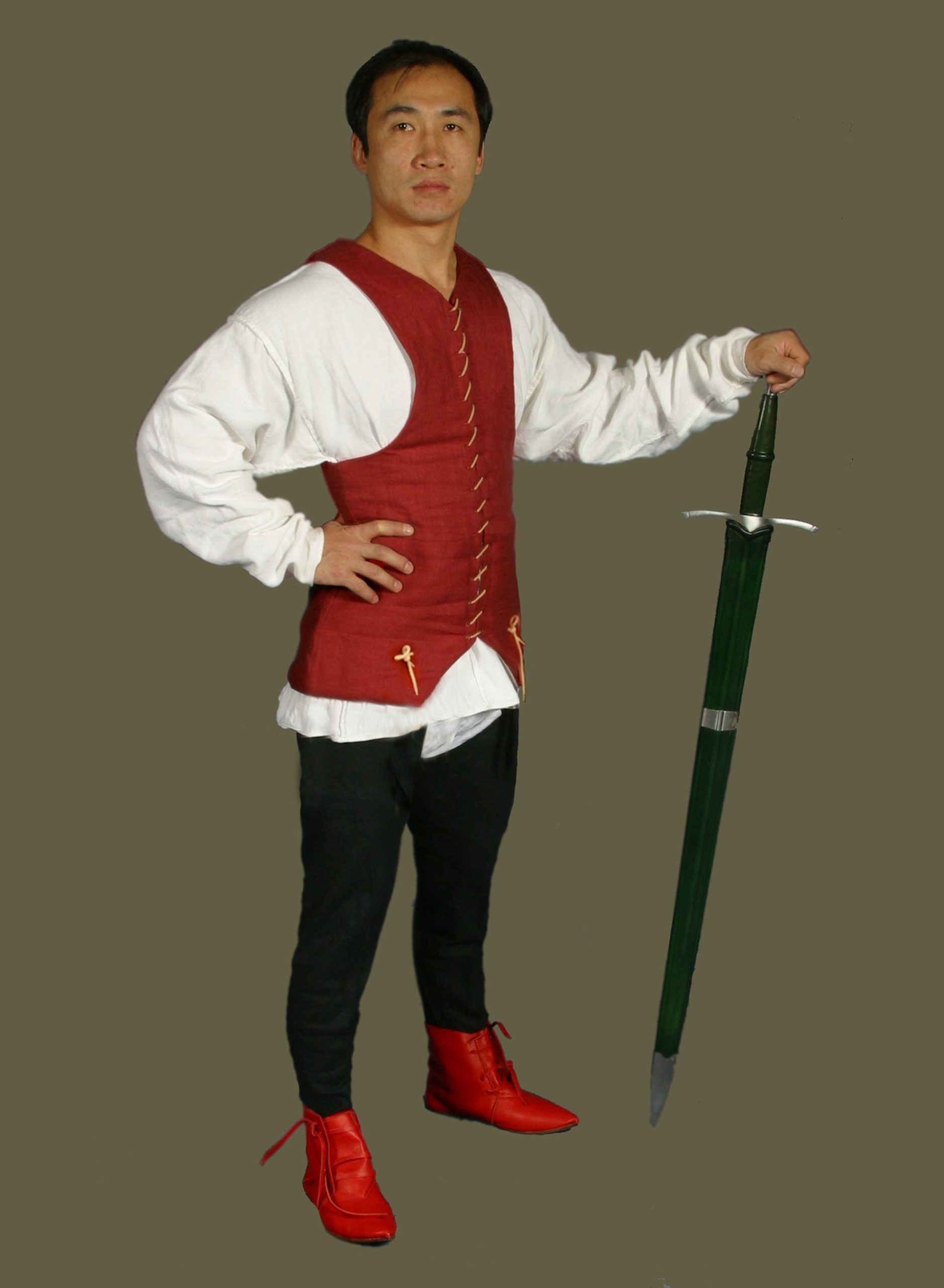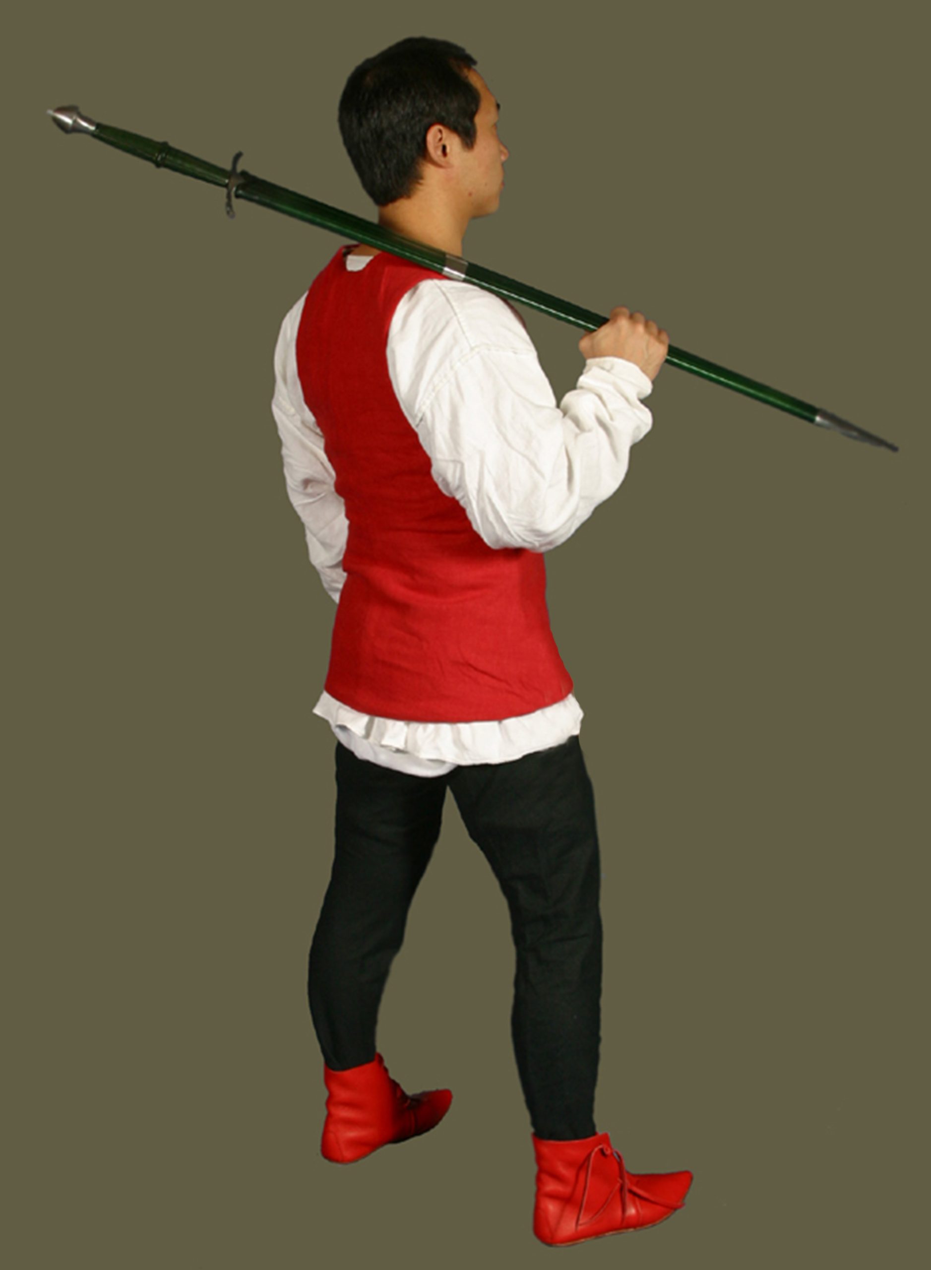 This fighter sports a red pourpoint with his Medieval Shirt, Braies and Chauses. He matches his Wool Garters to his red Tie Ankle Boots