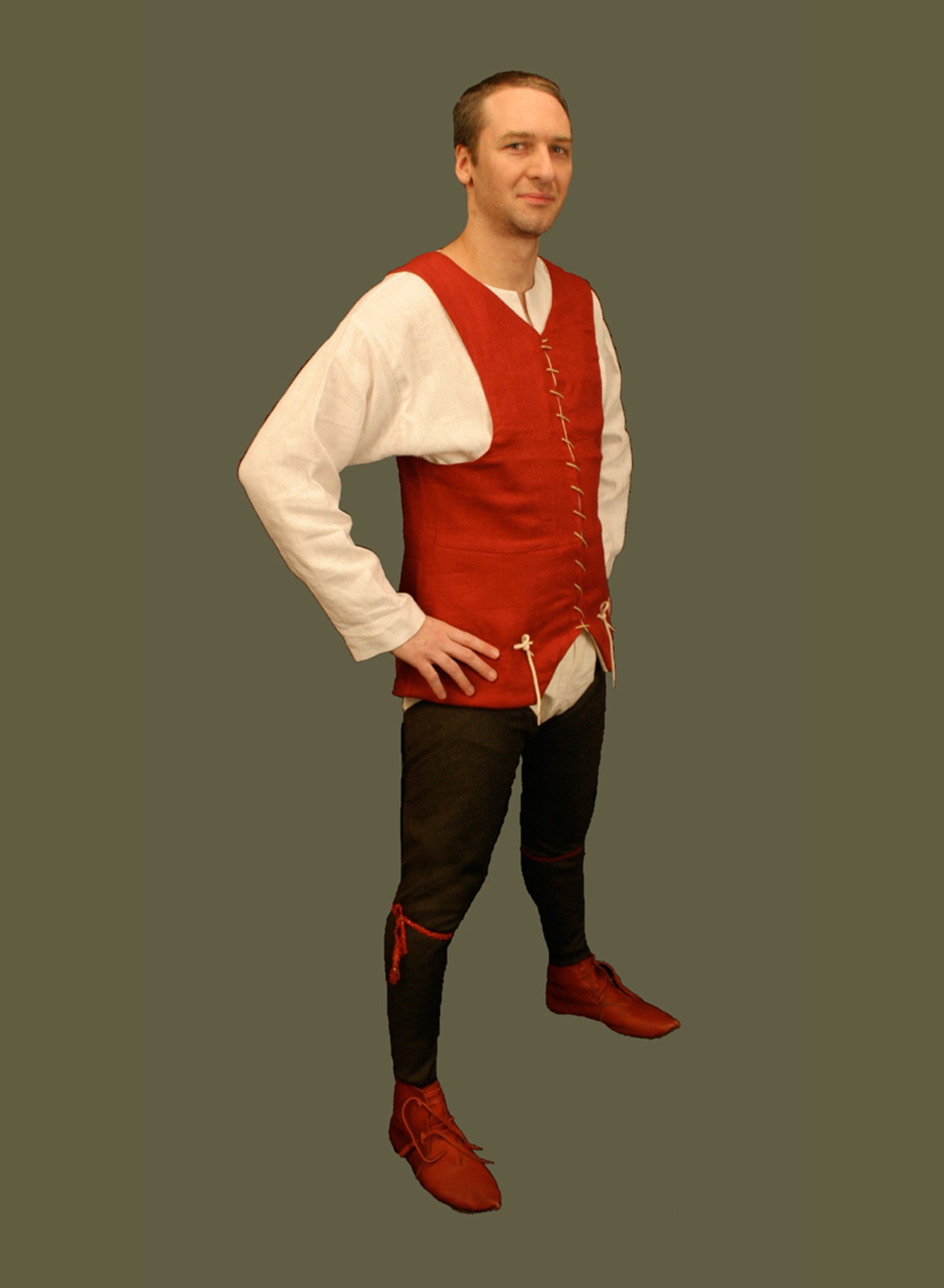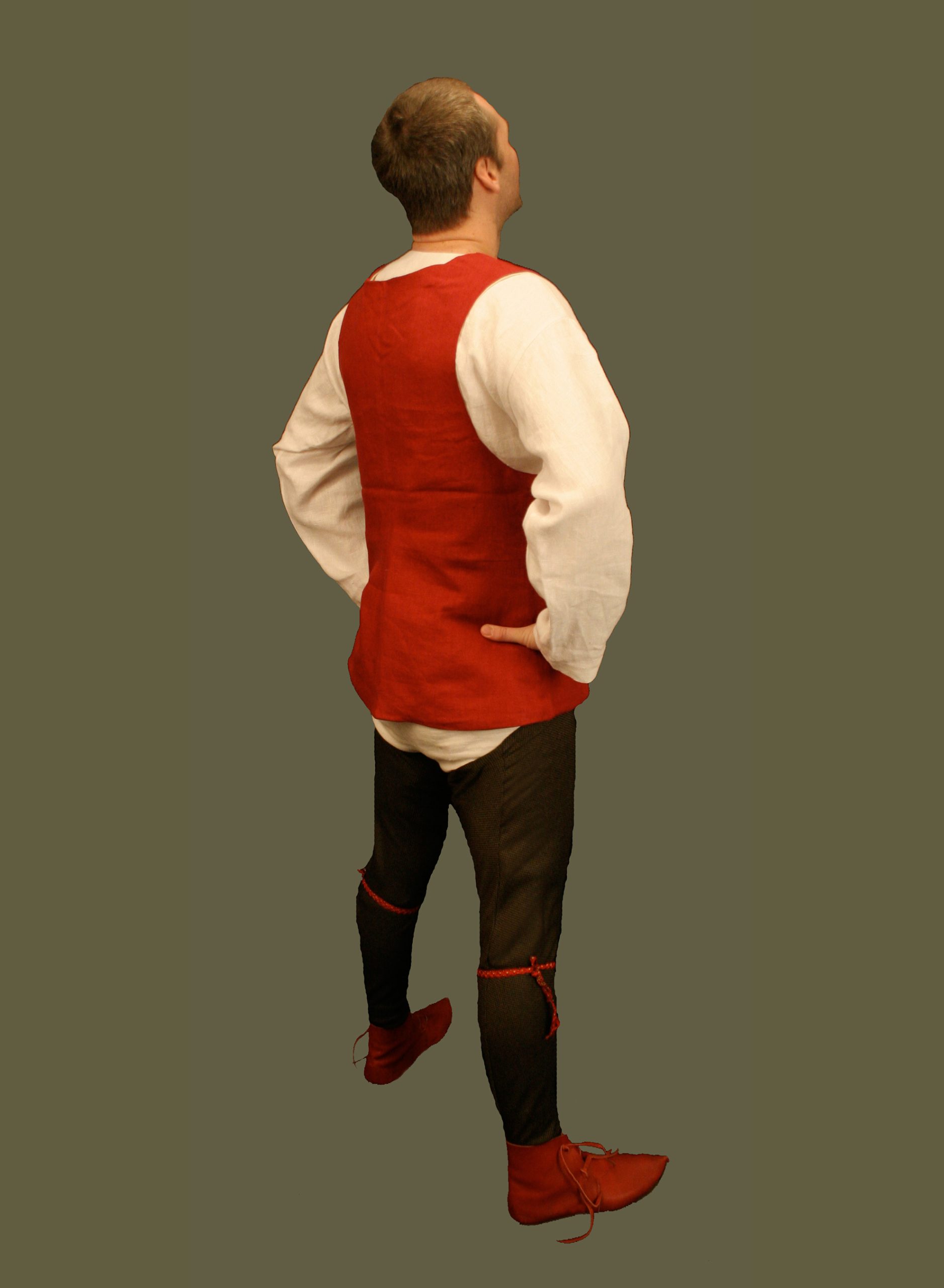 This fighter has exposed his red Pourpoint beneath his red Gambeson. His Braies and Medieval Shirt are just barely visible underneath. He sports a pair of black Chauses, and matches his Wool Garters to his red Tie Ankle Boots