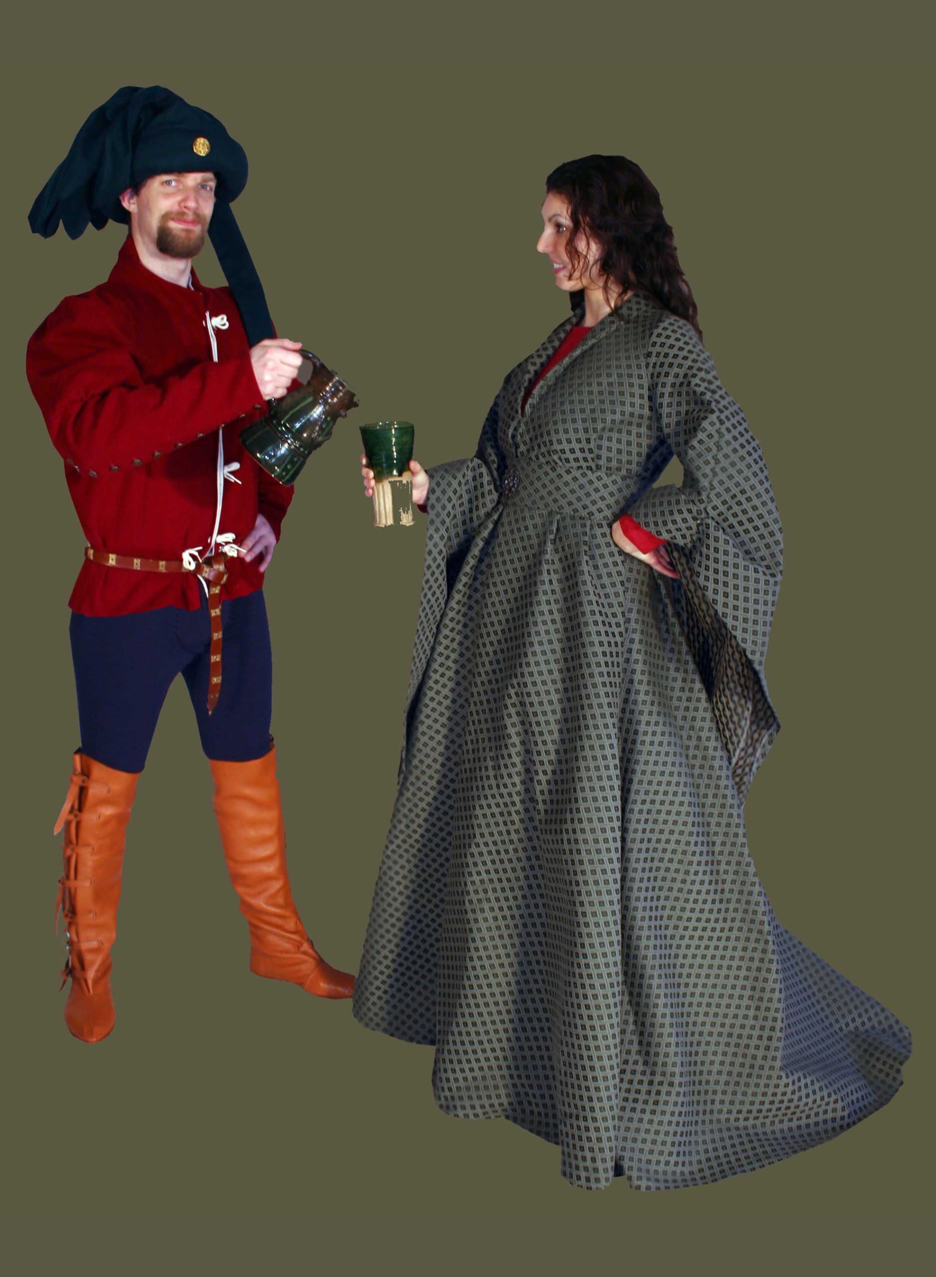 Left: This Lord kneels in admiration of his Lady in his green Wool Doublet and burgundy Joined Hose. He wears black Turnshoes to match his leather Belt and Pouch.