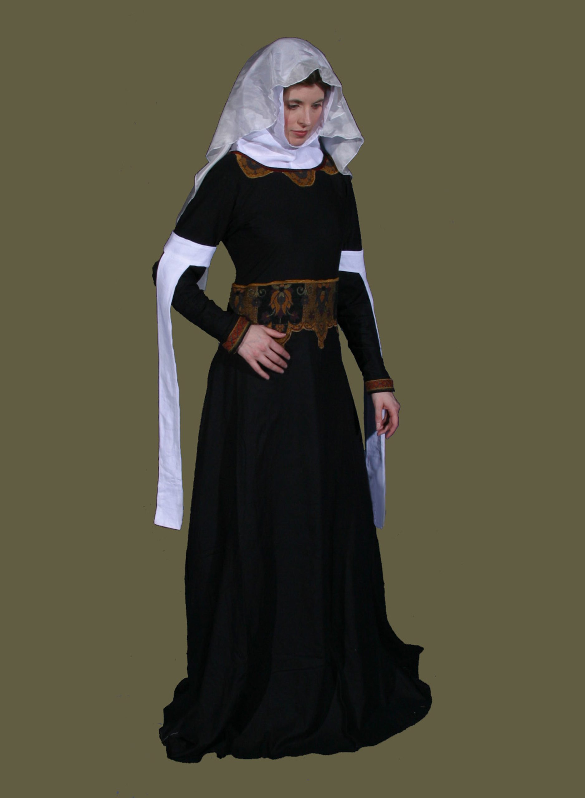 During the High Middle Ages (11th – 13th centuries) male and female fashions often emphasized a full-sleeved tunic or gowns over a tight-sleeved undertunic or gown, both of which were worn over a plain linen shirt or chemise. Towards the close of this period the sleeves of the overgarment were cut to end at the elbow and form long, pendant sleeves about a foot long, leaving the forearms covered exclusively by the undergarment. As the new style of tight-sleeved, fitted gown and male cotehardies came into fashion in the 14th century, the overgarment’s sleeve was now tight-fitting and extended to the wrist. The old pendant sleeve was replaced with a purely decorative strip of linen or silk fabric about three inches wide that was attached either temporarily or permanently around the sleeve just above the elbow; from it a long streamer fell anywhere from the knee to the ground. Early in the period the bands seem to have been worn to the front of the arms, but later “migrated” to the sides of the arms. These streamers, or tippets, were nearly exclusively white, and great care was exercised to keep them pressed free of wrinkles. Based on contemporary artwork, our removable tippets are made of lightweight, white linen, and are “one size fits most” fitting up to a 15 1/2″ arm, with a 28″ long streamer.