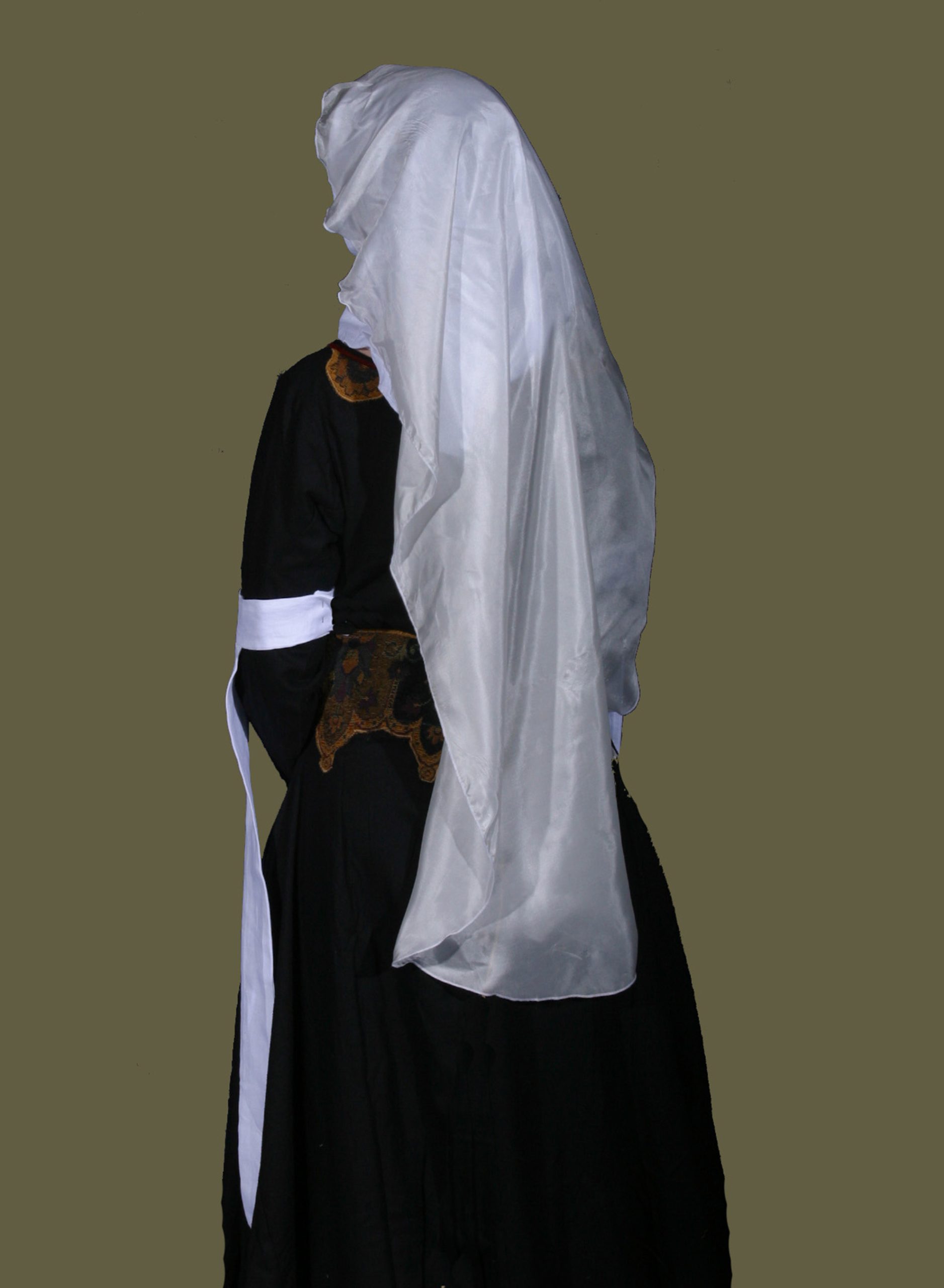 A woman kneels in prayer, she wears a black Backlace Gown with a Wimple and silk Veil to cover her head. Her tippets hang low from her upper arms just barely brushing the floor.