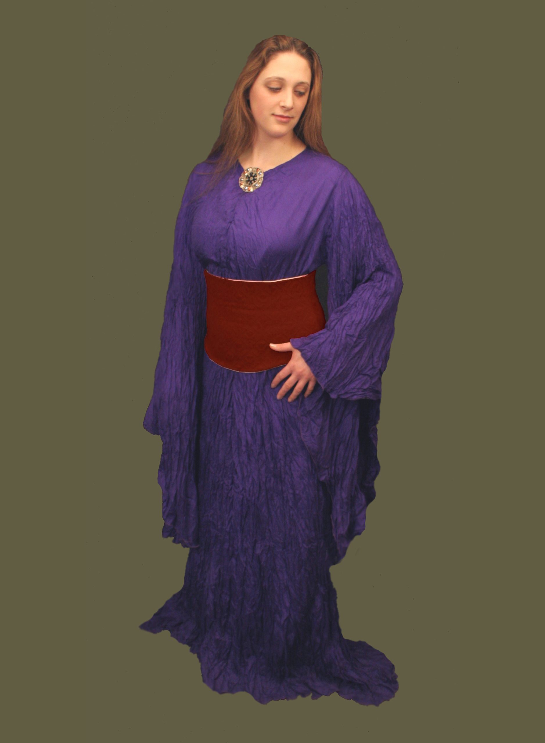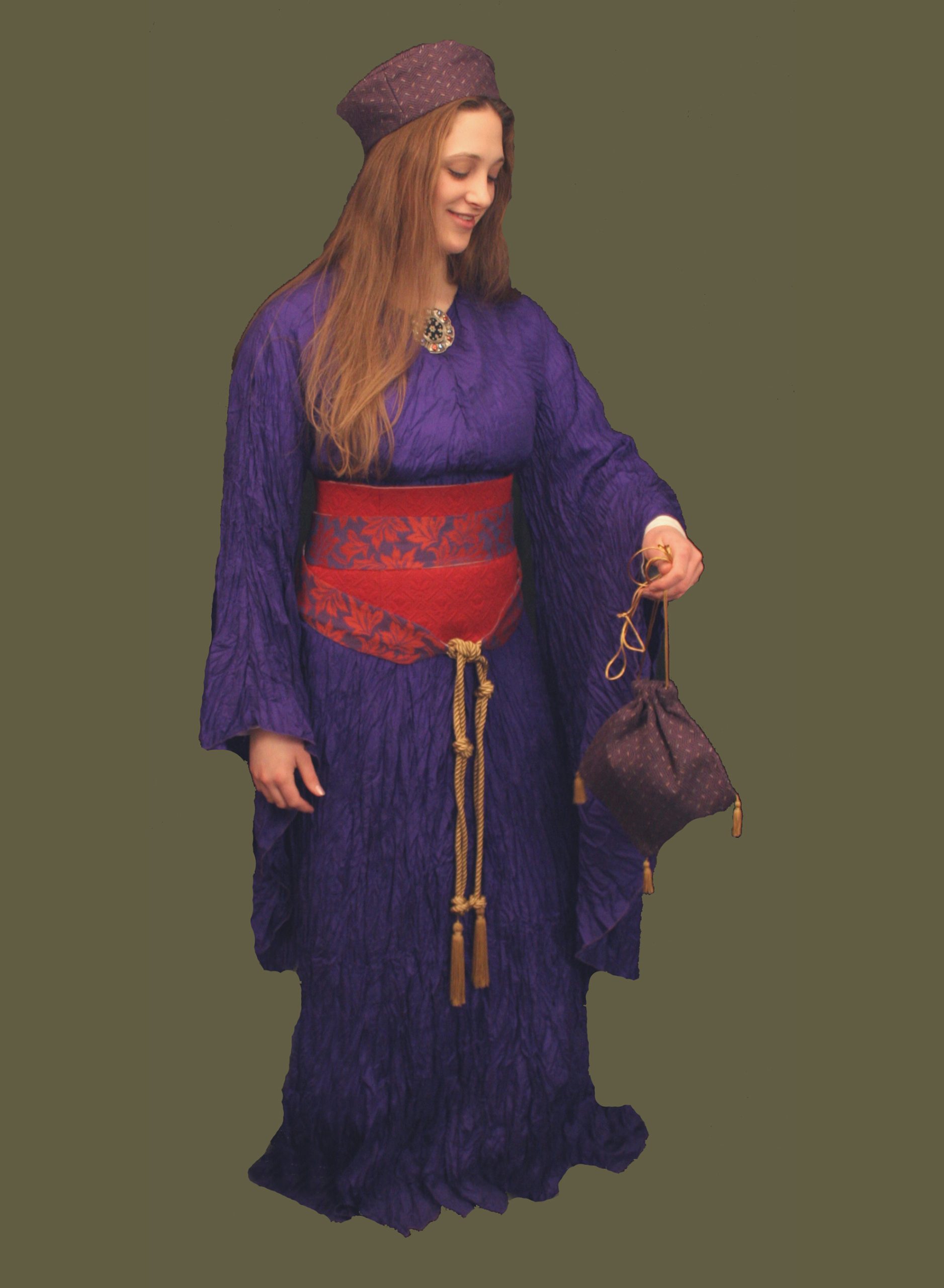 Purple bliaut with red stomacher , purple wrap belt, custom turret hat and custom tasseled pouch