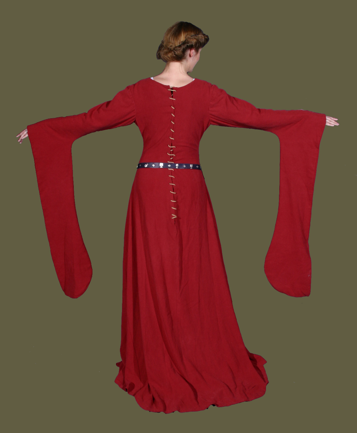 This Lady stands regally in her dark green and gold linen Pendant Sleeve Gown. Beneath, one can just see the sleeves of her white Underdress. She wears a rectangular Linen Veil with a burgundy Turret Hat on top, and a Decorated Belt at the waist. Hidden from sight she wears Stockings, a pair of Garters, and Ankle Boots.