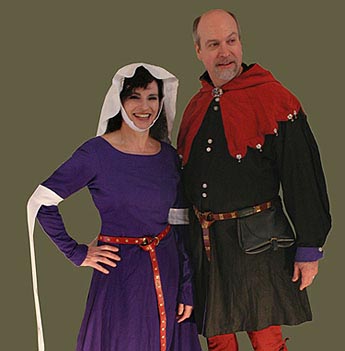 These authentic coordinating medieval outfits for Bride and Groom in 100% silk are currently featured in Renaissance Magazine’s 2008 wedding issue. Her gown is backlaced for a flattering, custom fit, has a small train and comes with linen chemise, head-wear, tippets, stockings and garters. His medieval cotte and hood are completely reversible for a variety of possible looks. His outfit includes linen coif, shirt, braies, and coordinating silk chauses (leggings). Both wardrobes can be ordered with the authentic medieval accessories shown: belt, pouch and shoes for that head-to-toe medieval effect. All items come a large variety of colors and are also available in linen and wool. If you would to inquire about a custom order for your special day, or any occasion please contact us atcsr@revivalclothing.comor (708)502-1937.