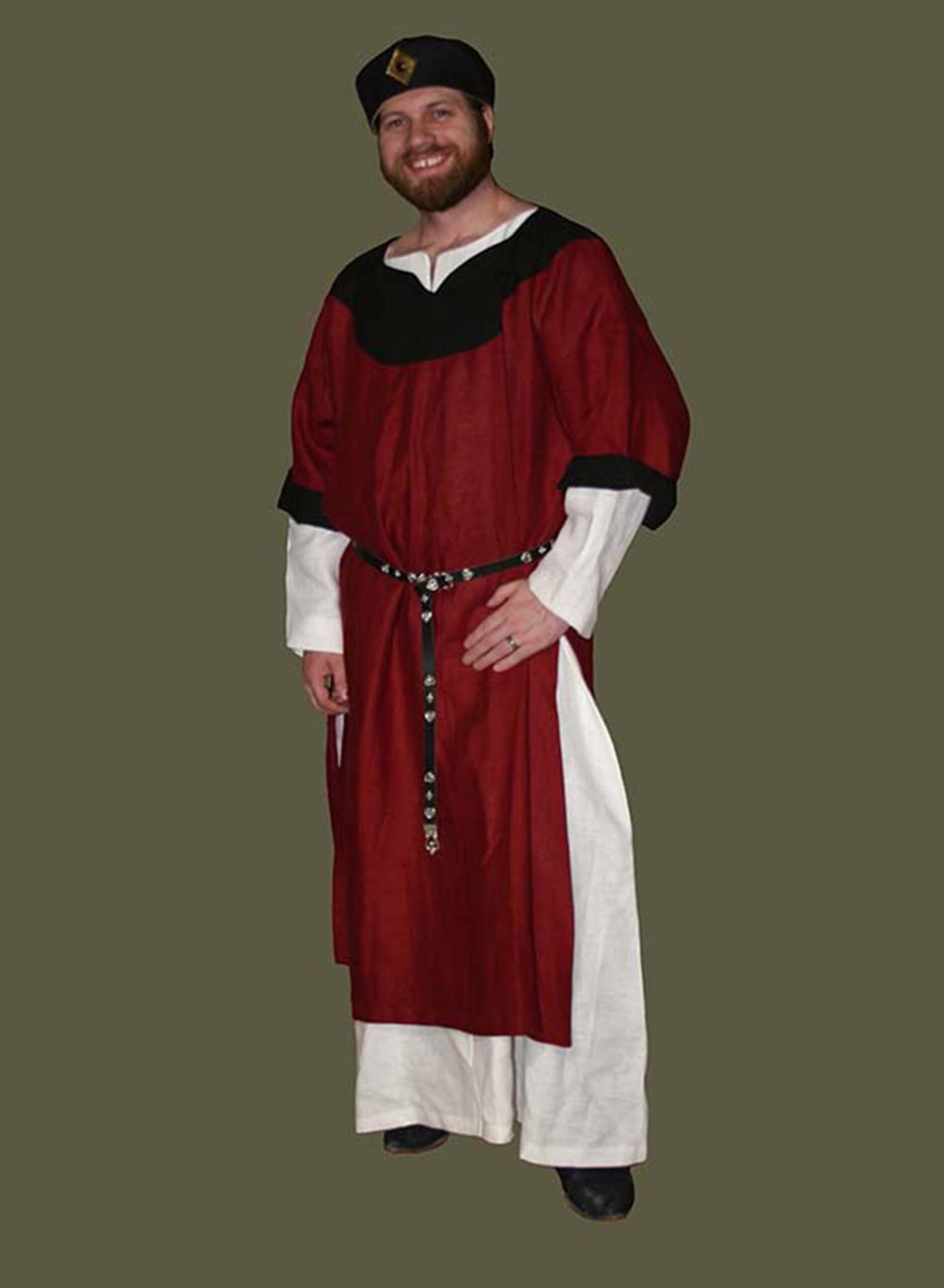 This era was also an age of innovation and elegance in civilian dress. Throughout the Norman lands in Outremer, Sicily, England and France, sumptuous garments that were a blending of old Western and Eastern styles predominated. Subtle, but significant changes transformed the old tunic of the previous centuries into several new styles. We have chosen a design that is well documented in historical artwork and stone effigies, and was fashionable amongst both young and old during the life of the famed Richard Cur de Lion (1157 – 1199) for its combination of style and comfort. The loose, sumptuous supertunic falls below the knees and has broad, three-quarter sleeves, a deeply cut neck hole and short side slits to both facilitate movement and better display the undertunic. The tunic is cinched at the wait with either a simple, moderately wide belt or a double-wrapped belt. Our opulent, supertunics are available in a selection of linen colors with contrasting sleeve lining and yoke. As always, the garment is produced with finished interior seams and no visible machine stitching.