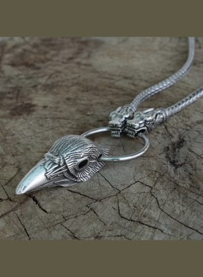 Our Viking Raven’s Head Pendant comes in antique silver color and is held on with wolf’s head Fittings. It comes with a matching 20″ chain.