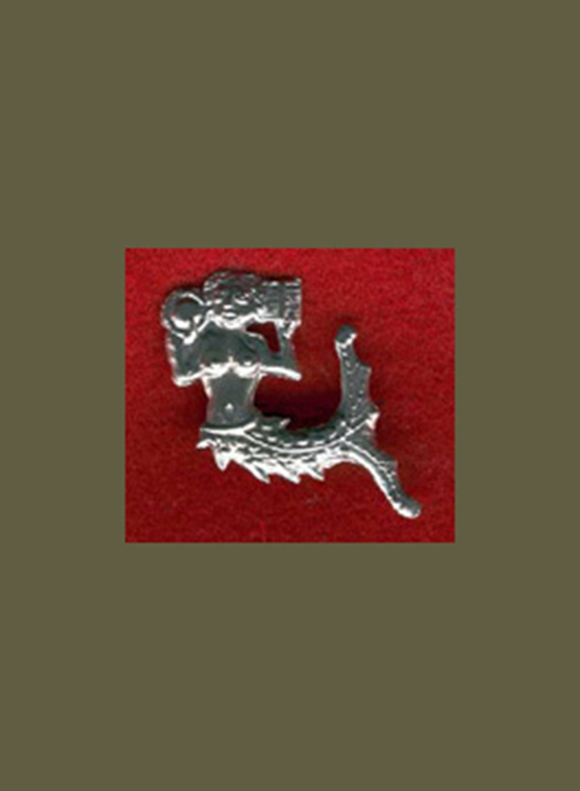 This badge depicts a mermaid holding a mirror and comb, traditional symbols of temptation and vanity.