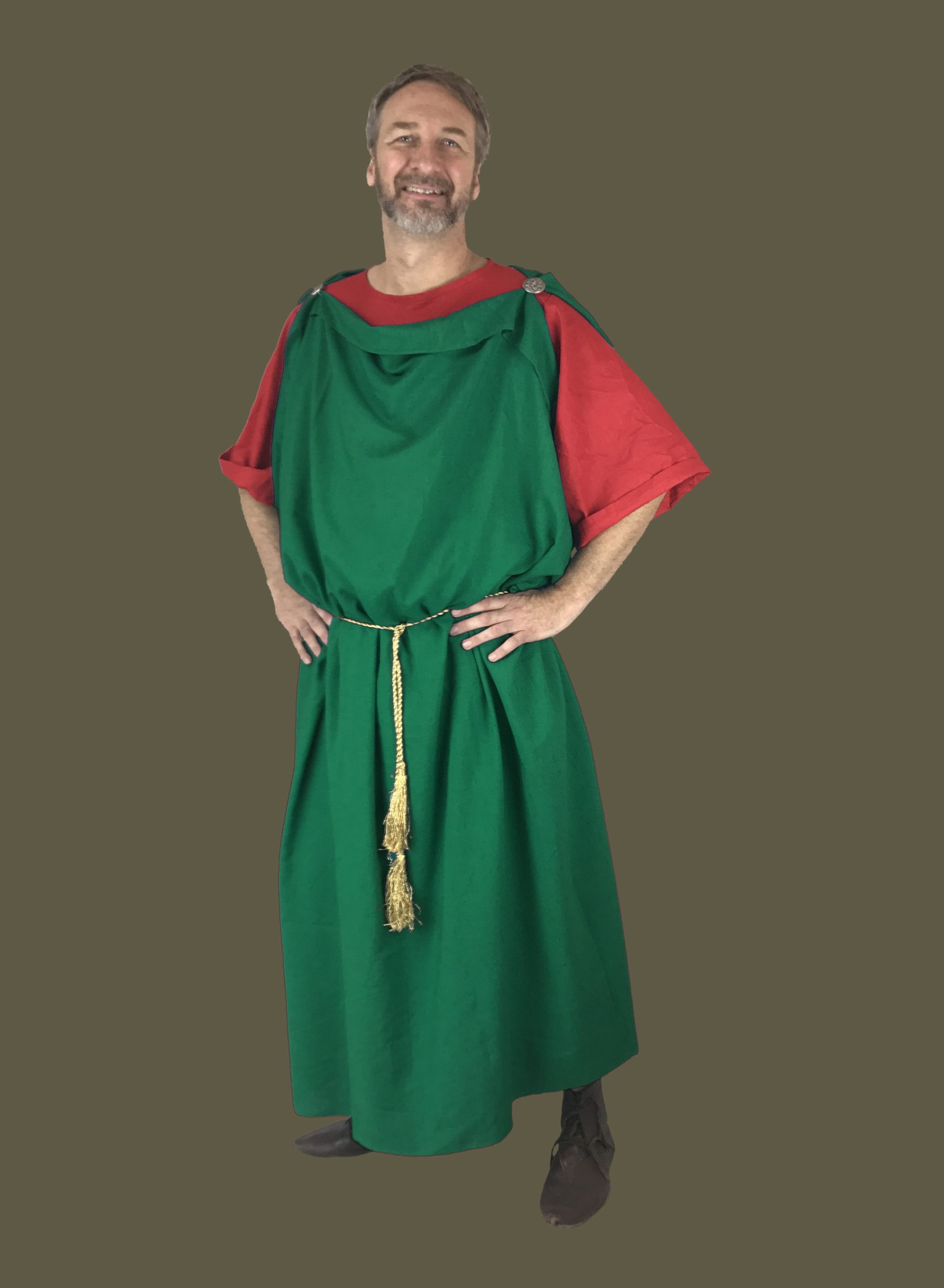 This peasant wears his Basics Short Sleeved Tunic under his green Chiton. He pins his Chiton in place with Metal Brooches, and ties a gold Tasseled Belt around his waist. He finished his look off with Ankle Boots