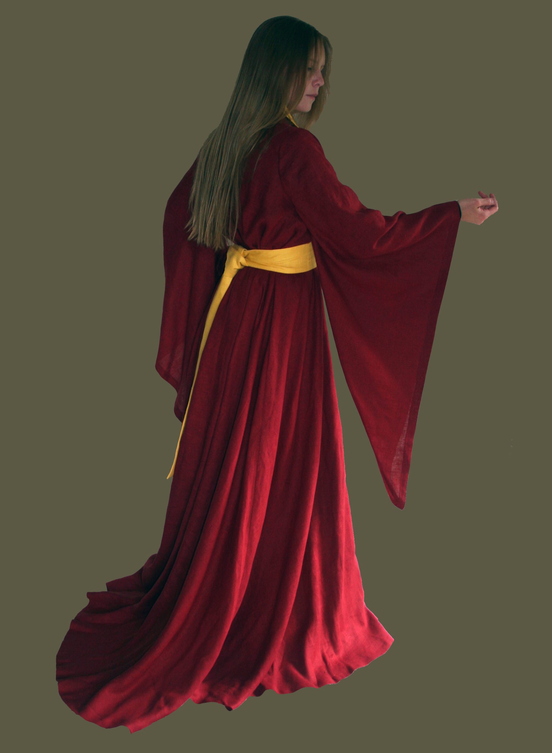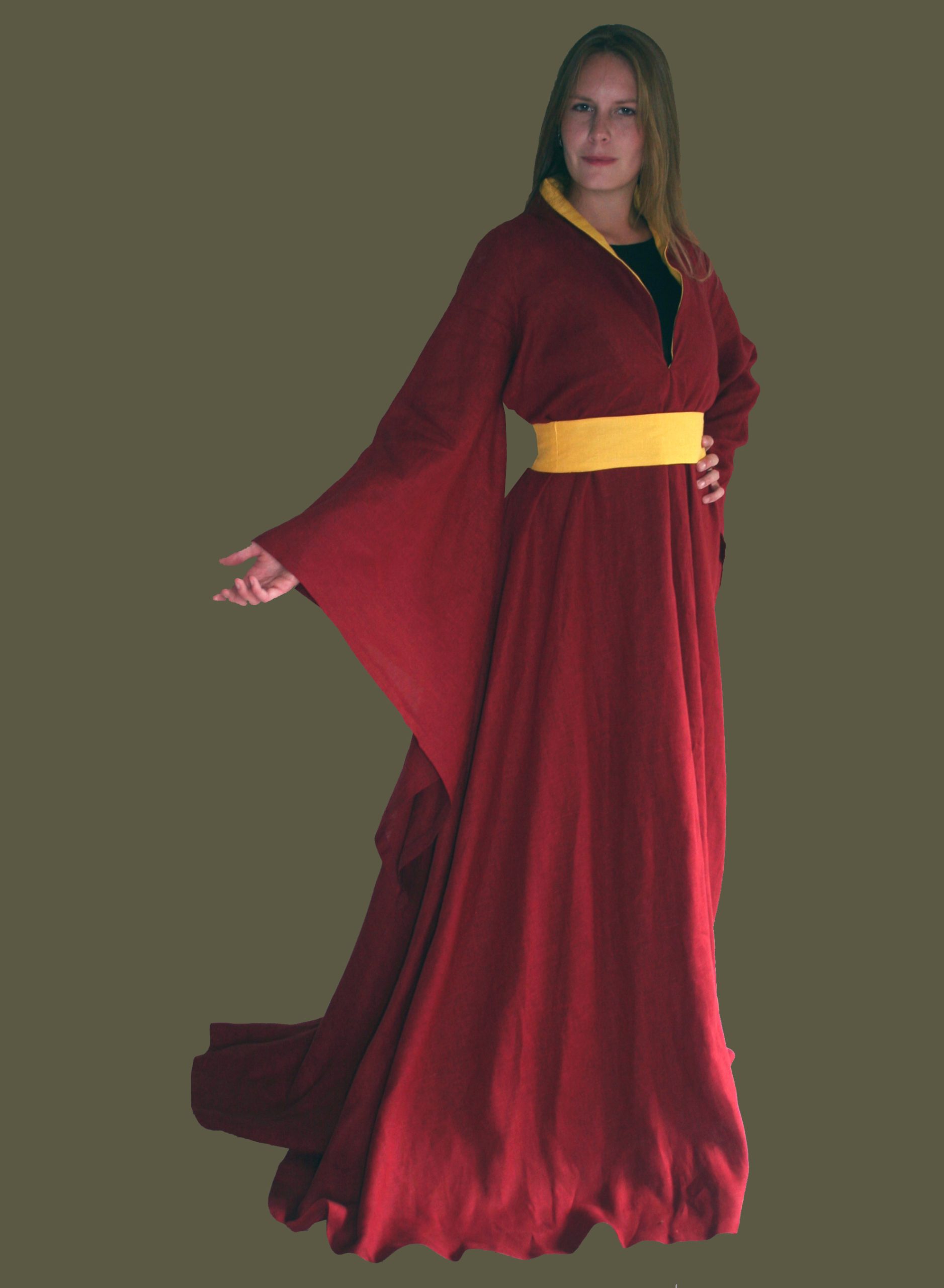 Note: In our women’s clothes we’ve abandoned ‘standard’, modern sizing because it is far from standard, and tends to cause more confusion than provide accurate information. So, please judge your size by your bust measurements. For this gown we’ve given only the maximum bust size range because this style gives an extremely flexible and flattering fit – it really does fit and look great on most sizes. This style flares dramatically from the bust line so waist and hips measurements are not an issue with fit. Although it is made of yards of fabric with generous sizing the beautiful drape of the brocade and the matching belt allows for a flattering fit in your size. The belt is meant to be pinned at the center back to fit you exactly and then use the end of the belt to create a loose ‘knightly knot’ to cover the pinned portion. Our Houppelande runs long so that you can wear it in the authentic fashion of the period – trailing along the ground or hem it to your desired length.
