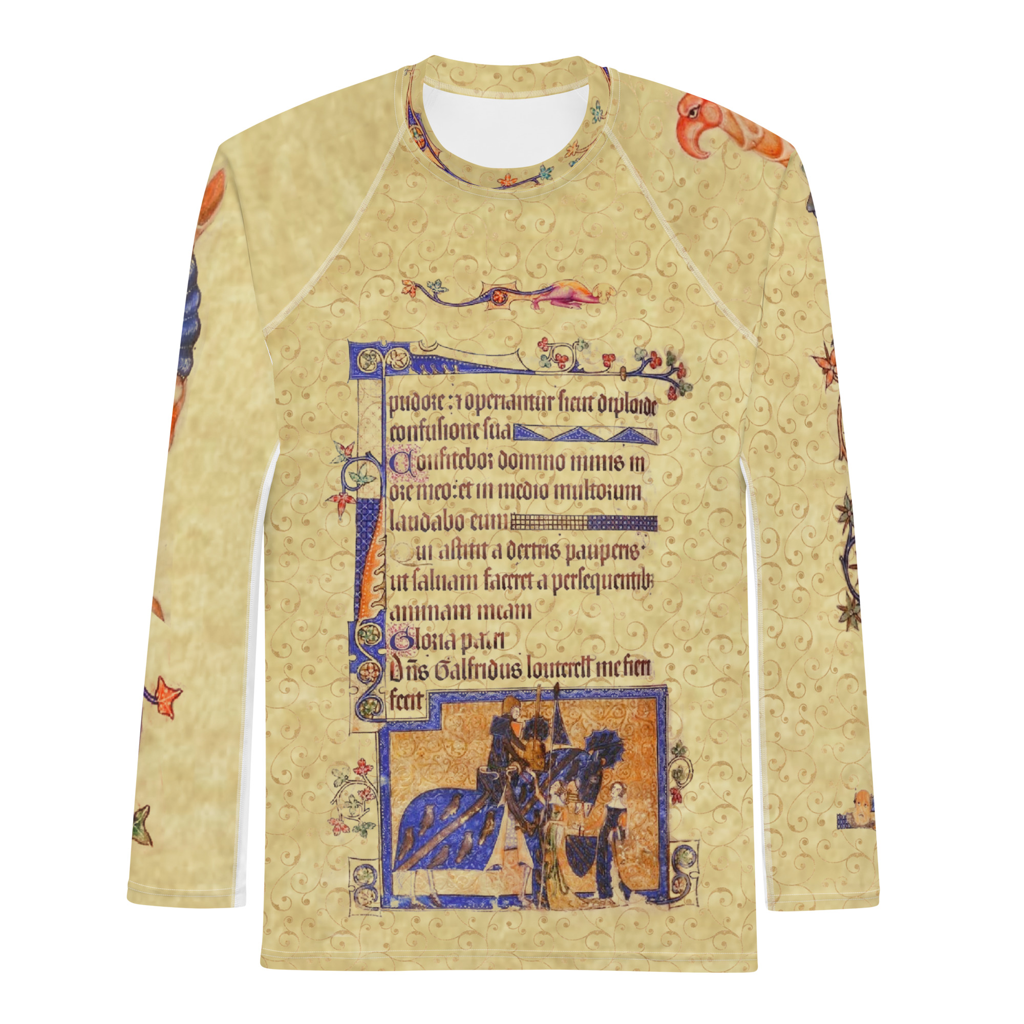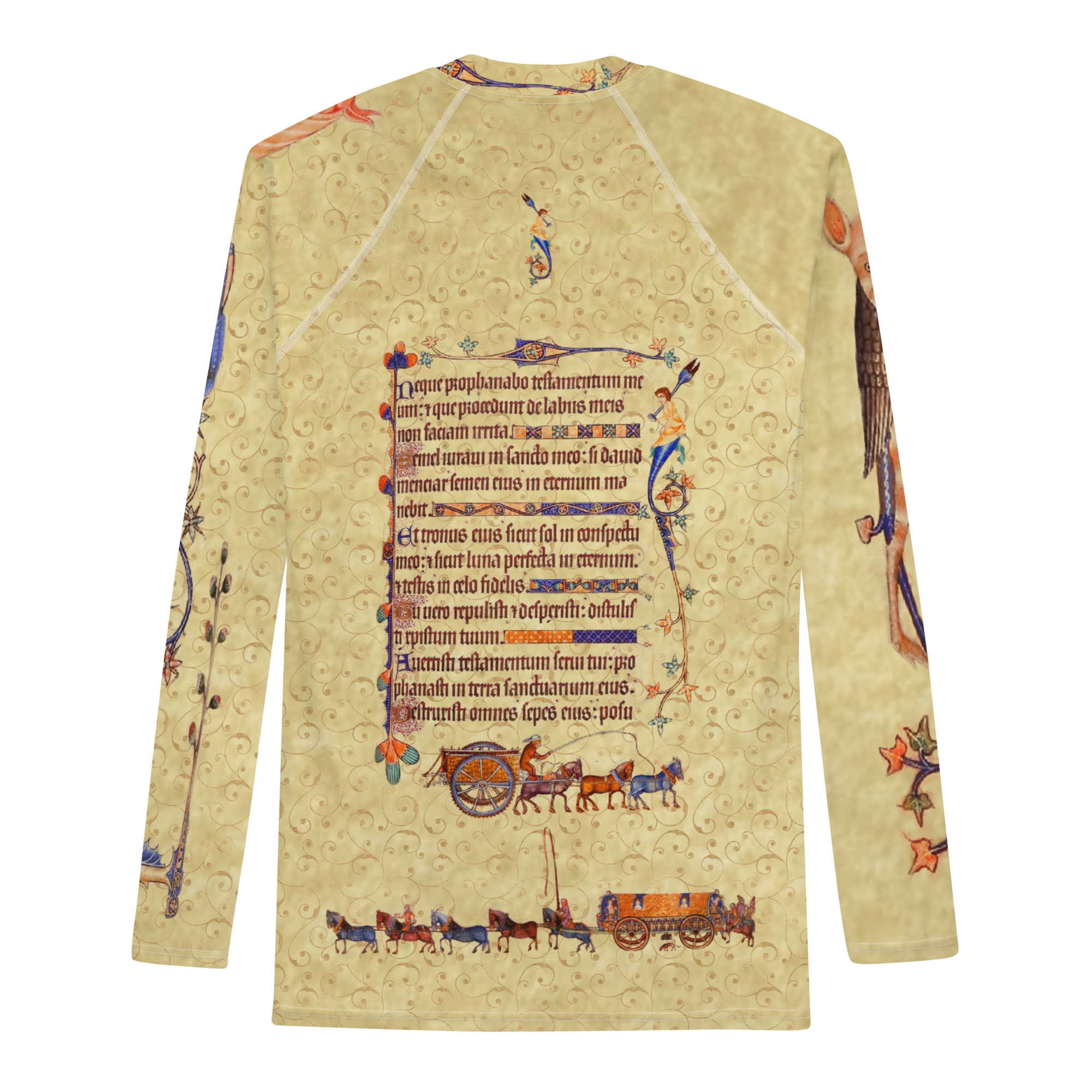 Our Luttrell Psalter Rashguard features an all-over print is inspired by the famous 14th c. Luttrell Psalter illuminated manuscript. Printed in high resolution, photo-realistic detail, our long sleeve shirt is 82% polyester, 18% spandex. The fitted design is made with soft four-way stretch fabric that stretches and recovers on the cross and lengthwise grains. Printed using Dye Sublimation with eco-friendly inks that are designed to last for years without fading in the wash. We are really excited about this phase of the project – translating these beautiful images into textile designs. Have a favorite image you’d like to see? Let us know!