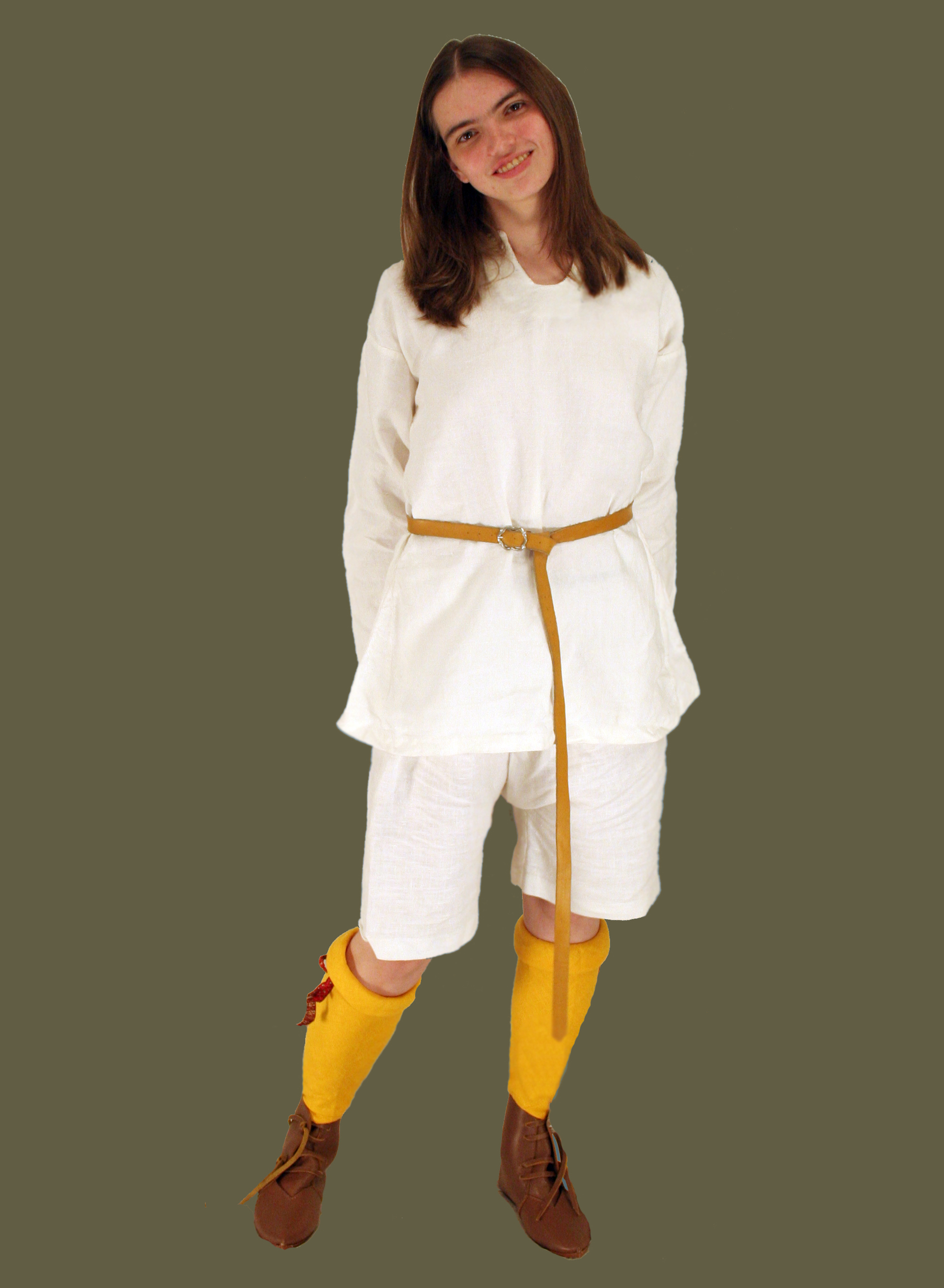 Our chauses are based on surviving historical artwork and extant garments. Made of a sturdy linen, our chauses are cut on the bias, with a clean, close fit in the ankle, creating the smooth line seen in historical artwork. They lace to the braies with a simple “point” (lace) and are cut high enough on the inside of the leg to keep the braies neatly tucked in. A final advantage to historical underwear that is often overlooked is comfort. The relaxed fit of the braies is of great comfort when lounging around camp, and in hot weather, the chauses can be rolled down and worn around the ankles, creating the medieval equivalent of shorts.